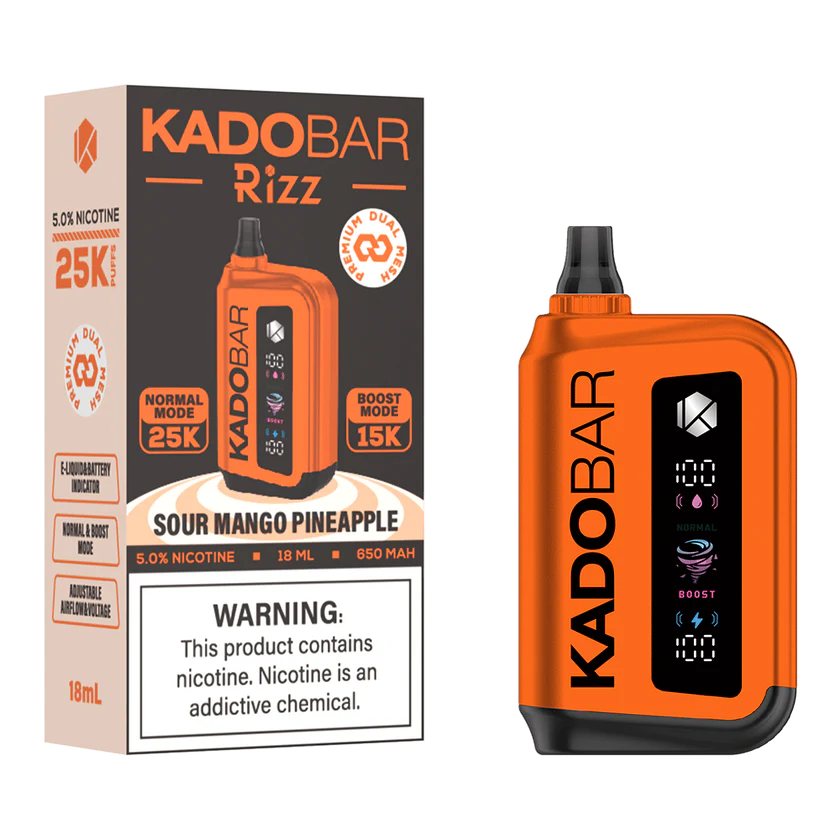 The Sour Mango Pineapple Kado Bar Rizz 25K Puffs Disposable Vape offers a dynamic flavor profile combined with advanced, user-focused hardware. We invite adult consumers to review the detailed product specifications to determine if this high-performance, versatile device meets their personal requirements.
